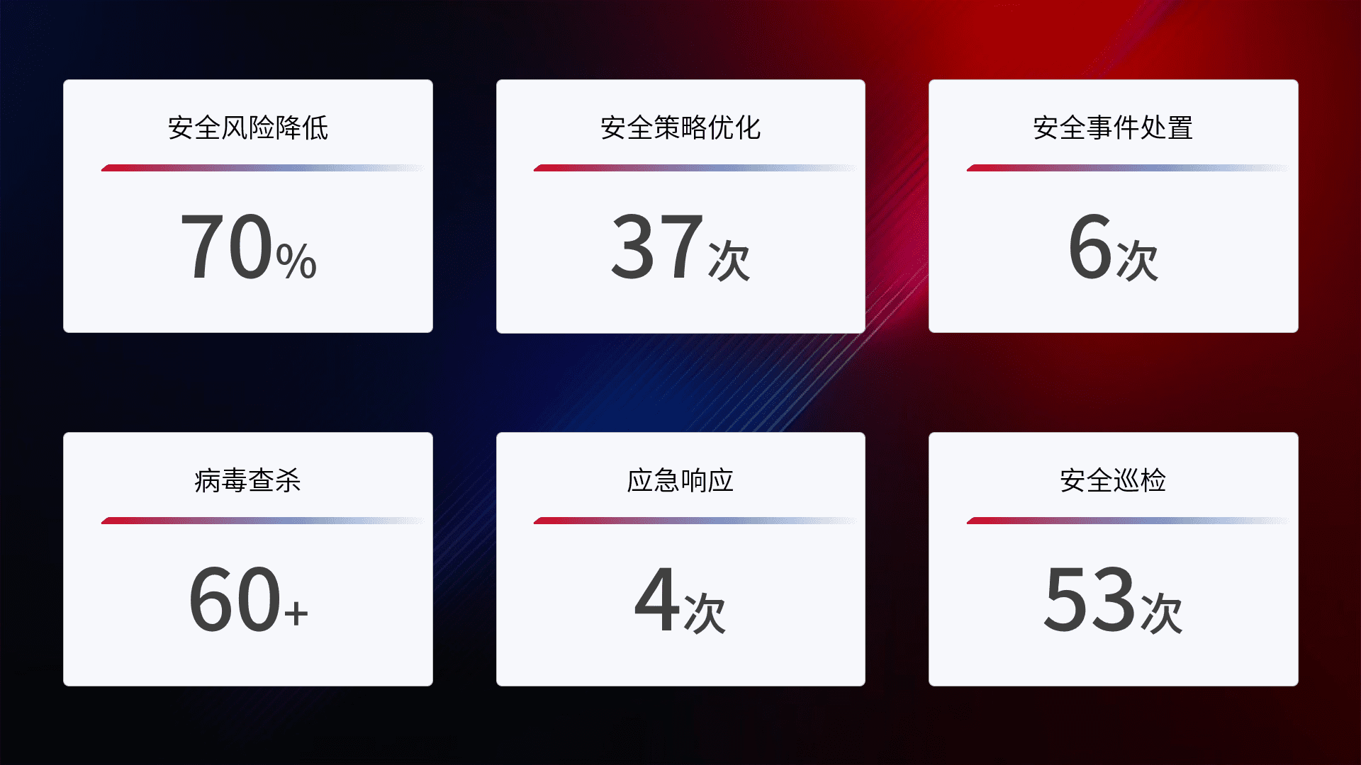 提供全面的安全事件报告体系,,,包括处置报告、、、周报、、季度和年度总结,,,,结合持续监控,,,,帮助客户深入了解网络安全状况。。